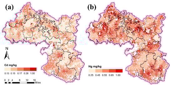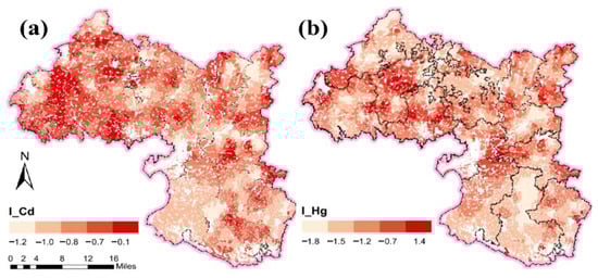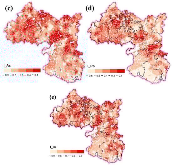 Figure 3 shows the inverse distance weighting of in ArcGIS software. The high-value area of Cd is mainly concentrated in the northwest region, Figure 6a. The spatial distribution of the geo-accumulative index of Hg is scattered from the center to the surroundings and then decreases in sequence, Figure 6b. The spatial distributions of the potential risk index for As, Pb, and Cr were relatively similar, being higher in the northeast, central, and eastern regions, Figure 6c–e.