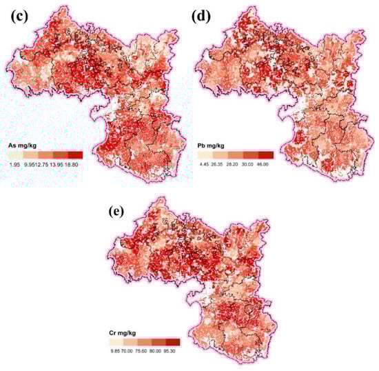 Spatial distribution of potentially toxic elements in soil in the study area. (a) Spatial distribution of Cd; (b) spatial distribution of Hg; (c) spatial distribution of As; (d) spatial distribution of Pb; (e) spatial distribution of Cr.