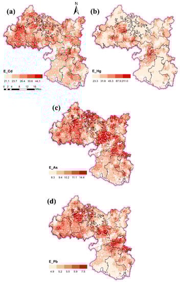 Inverse distance weighting interpolation was performed in ArcGIS software on the potential ecological risk coefficients of the sample points, as shown in Figure 5a–e, where the potential risk index of Cd is shown to be relatively high in the northeast, and the spatial distribution of the potential risk index of Hg is scattered from the center to the surroundings. The spatial distributions of the potential risk index of As, Pb, and Cr were relatively similar and successively decreasing, and these elements were all higher in the northeast and middle-east. The spatial distribution of the potential ecological hazard index is shown in Figure 5f. Strong–very strong ecological risk was found to be mainly distributed in the northeastern and central and western towns.
