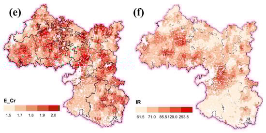 The spatial distribution of the potential ecological risk coefficient in the research region shown individually for (a) Cd, (b) Hg, (c) As, (d) Pb, (e) Cr and (f) IR.