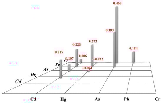 Spearman correlation analysis was performed on the data of the five potentially toxic elements in 326 soil samples using SPSS 22 software (Table 9 and Figure 7), and was chosen because it does not require normality of variables. The correlations between As and Pb and between As and Cr were found to be 0.393 and 0.466, respectively, indicating a greater likelihood of having common sources. The correlations between Hg and Pb, Cd and Hg, and Pb and Cr were 0.273, 0.215, and 0.184, respectively, indicating that they may have a common source.