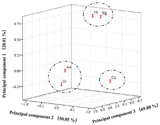 The Kaiser standardized orthogonal rotation method was used for principal component analysis, as shown in Table 10 and Figure 8. The multivariate was reduced to three factors (the characteristic root was greater than one). The first three components illustrated 69.88% of the total variable variance. The main variables of the first main factor (which explained 28.01% of the total variance) included Hg and Pb, indicating that these two elements have a high degree of homology; the second main factor (the increase explained 22.04% of the total variance) included Cd; the main variables of the third main factor (an increase of 19.84%) were As and Cr.