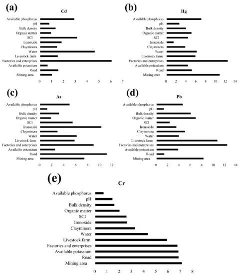 As shown in Figure 9, the variable importance measure represents the weight of the anthropogenic influencing factors. The top four factors explaining Cd were factories and enterprises (6.03%) > water (4.61%) > soil color index (SCI) (3.12%) > available phosphorus (2.89%), Figure 9a. The top four factors explaining Hg were factories and enterprises (12.41%) > mining areas (10.77%) > available phosphorus (7.05%) > water (6.12%), Figure 9b. The top four factors explaining As were roads (11.11%) > iron oxide (10.21%) > factories and enterprises (8.94%) > mining areas (7.39%), Figure 9c. The top four factors explaining Pb were factories and enterprises (12.40%) > livestock farms (10.69%) > mining areas (8.25%) > organic matter (6.89%), Figure 9d. The top four factors explaining Cr were mining areas (7.10%) > roads (6.83%) > available potassium (6.80%) > factories and enterprises (6.73%), Figure 9e.