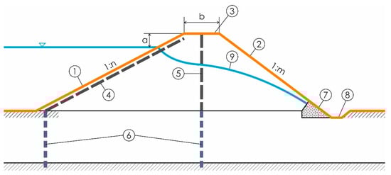 Schematic diagram of the cross-section of a levee, including the main elements [4]. (1)—upstream slope, (2)—downstream slope, (3)—crest, (4)—tight screen, (5)—tight core, (6)—subsoil ground sealing, (7)—drain, (8)—drainage ditch, (9)—depression curve in the case of a homogeneous embankment (without core). (a)—safety reserve, (b)—levee crest width, (1:n)—upstream slope inclination, (1:m)—downstream slope inclination.