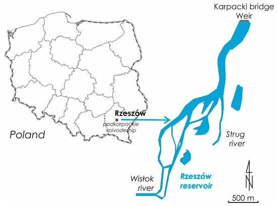 The water reservoir in Rzeszów (Podkarpackie Voivodeship, Rzeszów, Poland) was created in 1973 as a result of building a barrage in 63.7 km of the Wisłok River (Figure 2). Initially, the reservoir capacity was 1.8 million m3, and its area was 68.2 hectares. The catchment area of the reservoir is 2060.7 km2, with a total catchment area of the Wisłok River of 3528.2 km2. As a result of the silting process, the reservoir is currently about 60% silted up, so its original functions cannot be fully realized. It is estimated that approximately 1.5 million m3 of bottom sediments may be extracted from the reservoir. This intensive silting process is mainly the result of the way the catchment area is used, where agricultural land is over 70% (arable land—53.9%, orchards—1.8%, meadows and pastures—14.3%) [34]. The remaining part of the catchment area is forest land. In the catchment area, for the most part, there are poorly permeable, brown and silty soils, as well as alluvial soils with a mechanical composition of heavy clays and clayey silts [34].