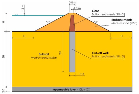 The calculations were made for the assumed embankment structures made of medium sand without seals and with a seal in the form of a core made of bottom sediments from the Rzeszów reservoir. The seal was in the form of a centrally located core width of 1 m in the upper part, enlarged at the base of the embankment, prolonged in the ground in the form of a vertical wall, maintaining the unsealed zone below the wall with a thickness equal to the height of the dam, according to the relevant requirements [51]. The foundation of the embankments was assumed to be on the ground built with permeable medium sands laying on an impermeable layer of clay. Calculations using the Bishop’s method were made for two calculation cases: without backwater and with continuous backwater; and using the FEM method, for three calculation cases: without backwater, with continuous backwater, and with variable backwater (dependent on the flood wave). It was assumed that during the passage of a flood wave, the water level rises to the maximum backwater level for two days (t = 2 d), remains at a constant level for three days (t = 5 d), after which the water level falls for two days (t = 7 d). The crest width of the embankments was assumed to be 3 m, with a slopes gradient of 1:2, heights of 4, 6, and 8 m, and position of the water level 1.5 m below the crest (Figure 3). According to the regulations on technical conditions to be met by hydrotechnical structures and their location, which are enforced in Poland [52], the minimum safety factor—regardless of the building class or with detailed tests on the parameters of soil in the body and ground under the basic load system—is FS = 1.3.