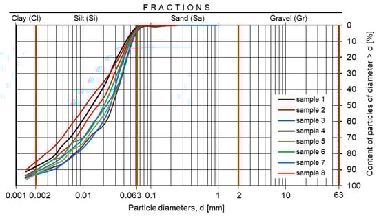 Bottom sediments taken from several places of the Rzeszów reservoir were classified as well-grained coarse silts or coarse clayey silts (Figure 4). The grain size composition was dominated by the silt fraction, which was from about 86% to 92%; the sand fraction was from 1% to 2%, and the clay fraction, from 6% to almost 13%. The specific density was from 2.58 to 2.62 g⋅cm−3.