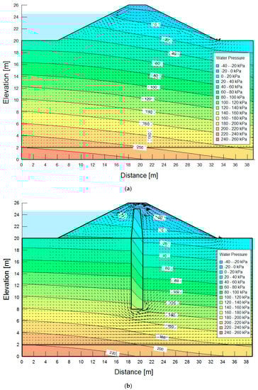 Location of the phreatic line and water pressure distribution in soil pores—embankment with a height of 6 m without a core (a) and with a core (b) (pressure in kPa).