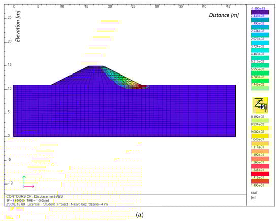 Calculations of the seepage through the body and base of the embankment using the finite element method showed that the value of the seepage for an embankment without a core was large and ranged from 7.4 to 32.1 m3·(d·m)−1, depending on the height of the embankment (Table 3). Considerably lower values were obtained for an embankment with a core—from 4.4 to more than 13.2 m3·(d·m)−1; there was thus an approximately two-fold reduction in the size of seepage.