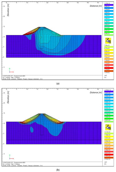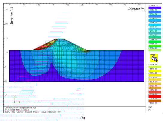 Movement isolines for FEM grid nodes at maximum backwater (a) and after the falling of the wave (b), for an embankment with a height of 4 m, with a core made of sediment at the passing of a flood wave.