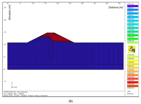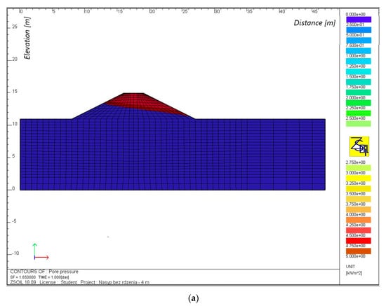 In each calculation case in the GeoSlope software for an embankment without a core, seepage occurred on the downstream slope. The phreatic line decreased as a result of using seals in the form of a core made of bottom sediments from the Rzeszow reservoir. Figure 5 shows exemplary pore water pressure values in the body of the embankment and its base with and without the seal. The course of phreatic lines and a significant reduction in water pressure indicate a restriction of the water flow.