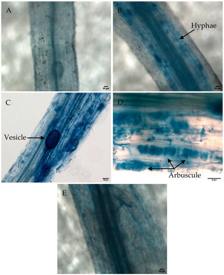 Microscopic analysis after trypan blue staining confirmed grapevine mycorrhizal root colonization by the AMF R. irregularis. The typical AM fungal structures such as hyphae, vesicles and arbuscules were clearly observed in the inoculated roots (Figure 1). The colonization rate of inoculated plants (10%) was significantly higher when compared to the non-inoculated plants (2%) (Figure 2). Other studies that assess AMF colonization rate of SO4 rootstock refer to higher colonization rates [36,37,38]. Even with 10% colonization rate, grapevine plants still benefited from the AMF inoculation as plant biomass was significantly higher in R. irregularis inoculated plants. The 2% AMF colonization detected in the non-inoculated plants is probably related to the fact that some of the cuttings presented already some root development. The few developed roots may have been colonized by AMF fungi, a common phenomenon in nurseries and already reported in other studies [39].