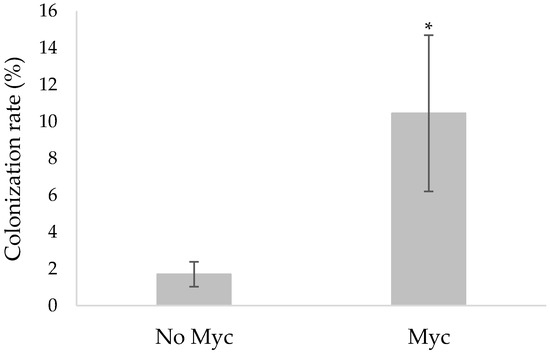 Colonization rate of mycorrhizal (Myc) and non-mycorrhizal (No Myc) grapevine plants 6 months after inoculation with R. irregularis. Statistical significance is represented by (*) (t-test p < 0.05).