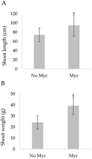 Effect of mycorrhizal inoculation on grapevine shoot growth. (A) Shoot length of mycorrhizal (Myc) and non-mycorrhizal plants (No Myc). (B) Shoot weight of mycorrhizal (Myc) and non-mycorrhizal plants (No Myc). Statistical significance is represented by (*) (t-test p < 0.05).