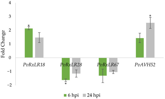 A total of four effector genes, PvRxLR18, PvAVH52, PvRxLR28 and PvRxLR67, exhibited changes of expression in mycorrhizal plants when compared with non-mycorrhizal plants upon infection with P. viticola (Figure 4). These results show for the first time that pathogen effector gene expression may be altered by plant mycorrhization. Effector PvRxLR18 showed a significant expression increase in mycorrhizal plants at 6 hpi (2.15 ± 0.11-fold change), while at 24 hpi this effector was still up-regulated but the difference between mycorrhizal and non-mycorrhizal plants was not significant. This effector was studied in infected detached leaves of V. vinifera cv. Muscat Ottonel, where expression was detected early at 6 hpi, with peaks of expression reported at 24 hpi and 48 hpi [9]. A high PvRxLR18 expression was also detected at 12 hpi and 48 hpi in inoculated detached V. vinifera cv. Cabernet Sauvignon leaves [10]. An early induction of PvRxLR18 at 6 hpi was reported in two grapevine cultivars, one susceptible (Müller–Thurgau) and another tolerant (Regent) to P. viticola infection [45]. Like PvRxLR18, the expression of effector PvAVH52 was also up-regulated by mycorrhizal inoculation on grapevine plants, with a significant increase at 24 hpi (2.54 ± 0.40-fold change). This effector was reported to have a bimodal pattern of expression (increased expression at 6 hpi, that lowers at 12 hpi and is higher again at 24 hpi), being also expressed later 72 hpi [15].