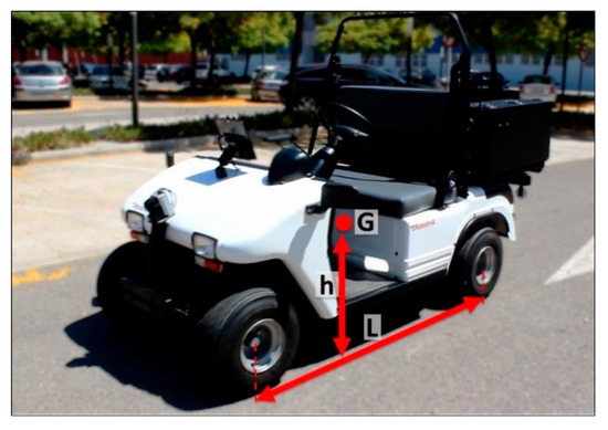 The RBK system is an electric vehicle for people and freight transport. It is powered by a hydrogen fuel cell and batteries with autonomous operation capacity (Figure 1). It has a rear-wheel drive, front-wheel steering Ackerman kinematics, and its main features are power 3.3 kW, mass 690 kg, top speed 32 km/h, length 2.66 m, width 1.23 m, height 1.70 m, wheelbase L = 1.65 m, height of the center of gravity (G) h = 0.50 m, distance from G to the front axle La = 1.10 m, and distance from G to the rear axle Lb = 0.55 m.