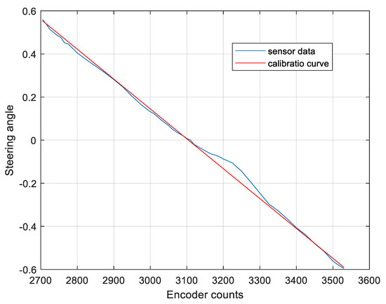The car-like vehicle has several proprioceptive sensors. The AC motor for vehicle traction has an incremental encoder, and the steering system has an absolute encoder of 12 bits of resolution for measuring the vehicle’s steering angle. In this work, it was necessary to calibrate the steering sensor. Figure 3 shows the encoder and the angle information, and the calibration obtained. The square of the correlation coefficient obtained for the sensor calibration was R2 = 0.9985.