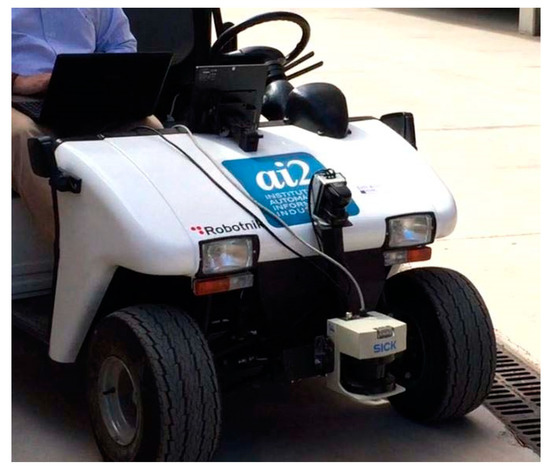 In this work, the laser sensor has been located in the front of the vehicle (see Figure 5). The sick_scan package [35] was used to install and program the LMS291 laser sensor. This driver provides the measurement data as a point cloud. These data are the distances between the laser sensor and the objects, calculated by measuring the time of flight of laser light pulses.