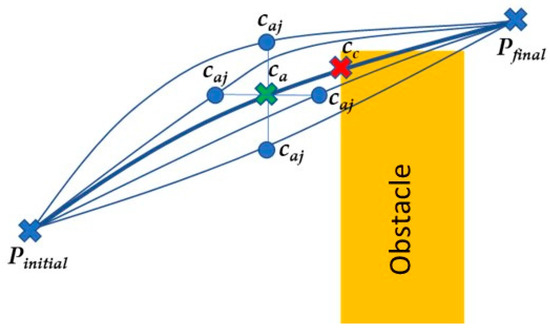 - Search for collisions in the minimum time trajectory . If there is a collision cc, a previous point ca in is determined, otherwise is the solution.