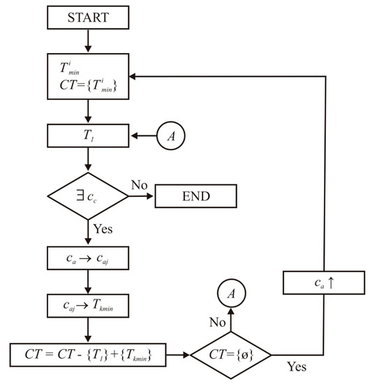 - Blocking check: if CT is an empty set, return to step 2 by performing and increasing the step to obtain . Otherwise, return to step 2 without modifying CT.