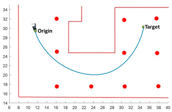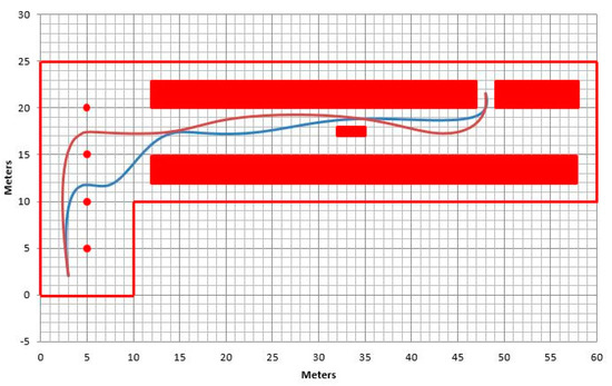 In addition, to validate the navigation system numerous tests were carried out as explained in Section 5 by considering both numerical simulations and an actual electric vehicle. They entail different scenarios in which the position of fixed obstacles, the consideration of several dynamic obstacles and the limitations of the maximum energy consumed were varied, and were performed at the CPI-UPV outdoor garage. Figure 13 shows the first test. This was a simple trajectory from the origin point (11.5, 29.5) to the target point (35, 30). In red the walls and the columns of the garage are represented. The blue line shows the original trajectory generated by the algorithm proposed in this work.