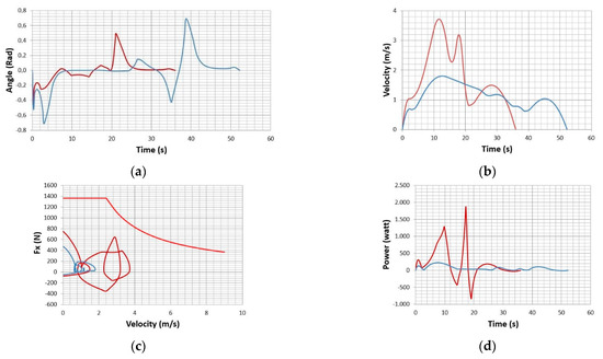 Figure 9a shows how the constraint acts on the steering in the low-velocity trajectory that makes tighter turns. Figure 9b shows the evolution of the velocity in each trajectory, which is higher for the trajectory with higher energy consumption. The evolution of the driving force with the velocity of the robot is shown in Figure 9c, where the limit imposed by the motor has been indicated in red, and it can be seen how the constraint works for Case 1. Figure 9d shows the power applied to the rear wheels along the trajectory, which will be positive when supplied by the engine and negative when braking. The integration of the positive part allows us to obtain the energy consumed. Again, it is worthwhile mentioning that, although there are other approaches for autonomous vehicle path planning [40], the main difference of the present work regarding these algorithms is its capability to optimize vehicle navigation while considering energy consumption, together with typical vehicle dynamic behavior and obstacle avoidance.