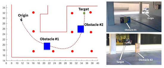 Figure 15 shows the second scenario presented in this work. The original trajectory generated (dashed line) was similar to the path of the first test, but in order to validate the proposed solution two dynamic obstacles have been placed at the navigation trajectory: Obstacle #1 and Obstacle #2.