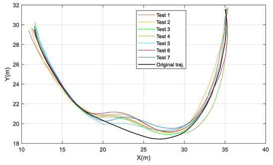Figure 16 shows the response of the vehicle when only Obstacle #1 was placed. The original trajectory (without obstacle) is represented in black and with double thickness. Hundreds of simulations have been carried out with different scenarios in which the position of fixed obstacles and the limitations of maximum energy consumption were varied. The remaining curves in Figure 16 show seven of these tests performed on the vehicle. The starting position of the tests differs slightly, because it is complicated to place the vehicle in exactly the same original position.