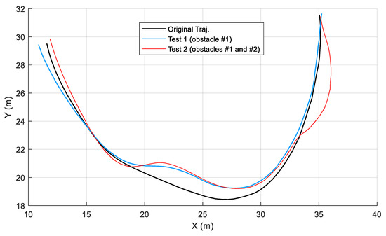 Figure 17 shows the response of the vehicle in a more complex scenario. The original trajectory without obstacles is shown in black, in blue when obstacle #1 was located, and in red when obstacles #1 and #2 were placed.