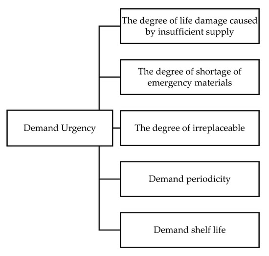 After the disaster, the victims have a large demand for all kinds of emergency materials. However, the urgent need of materials is different, the dispatching of all kinds of emergency materials should be divided into priority. Therefore, in the stage of disaster preparedness, all kinds of emergency materials should be graded scientifically and reasonably. Considering the time utility value of emergency materials, three factors that affect the urgency of emergency materials demand are determined, namely, the degree of life damage caused by insufficient supply, the degree of shortage of emergency materials and the degree of irreplaceable. On this basis, considering the volatility and variability of emergency material demand, they will have an impact on the demand urgency. The higher the volatility and the shorter the shelf life, the higher the sensitivity to time, and thus the higher the degree of demand urgency. Therefore, the emergency supplies grading index system based on the demand urgency is established by adding two influencing factors of demand periodicity and shelf life, as shown in Figure 2.