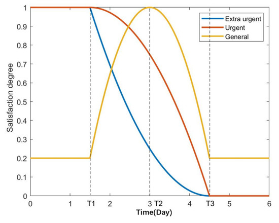 Due to the different degree of urgency of demand, the satisfaction of victims is different when different grades of materials are delivered to the demand point in different rescue stages. In this paper, the time effect value function is introduced to describe the rescue quality and the time effect value represents the satisfaction value of victims when the needs are met at different time. Table 1 shows the time effect value function of the three levels of demand. The trend of satisfaction of extra urgency and urgency materials is similar: during stage , the satisfaction value reaches to the peak at 1, then the satisfaction degree decrease gradually with the time delay between and decline rate of extra urgency demand is faster than urgency demand. After , it declines to 0. For general materials, at the first stage of , the satisfaction degree was 0.2. At the stage of , the satisfaction increases and reaches the peak at . Between , the satisfaction falls and returns to 0.2 after . As shown in Figure 3.