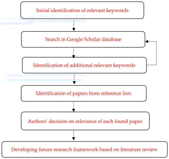 We applied a non-systematic literature review method in our research. The main goal of the non-systematic literature review method was to identify a gap in the literature and to define future research directions [,,,]. These goals were in compliance with our paper’s main purpose to develop the future research framework for assessing consumer resilience to online privacy violation. A flow chart of the entire process of the literature search is depicted in Figure 1. Literature searches were conducted through several iterations in Google Scholar database using relevant keywords related to resilience, its antecedents, and its outcomes. Moreover, additional papers were identified from reference lists from the retrieved papers. Authors made a conscious, joint, and iterative decision to consider each found paper as relevant, and to include them in this review.