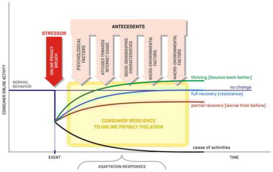 Early resilience studies gave more attention to the individual developmental processes whereby the individual’s environment factors, which typically included their family, school, institution, or community, were connected for their influence on an individual, typically a child []. Personal qualities associated with individual resilience were identified as protectors from the negative influence of external stressors. In contrast, Rutter [] interpreted individuals’ resilience in terms of individual personality traits that were correlated with successful coping under stress, including reducing the risk of exposure and preventing the negative impact of risk factors. He further noted that, in a situation with the same disturbance dose and pattern, responses are highly heterogeneous []. In this research, we connected online privacy violation and resilience, and resilience is explored at the cross section of engineering, psychological, and individual contexts (see for example []). Thus, this research borrows resilience concepts from disaster management and organizational fields, which account for previous experience and any periods of regressive behavior. However, the foundational premises of resilience in consumer behavior come from scientific fields that explore the human behavior of individuals. From the individual viewpoint, resilience is understood as an interactive concept dealing with the aggregation of individuals’ severe risk experiences with a different relatively favorable psychological outcomes despite stressors [].