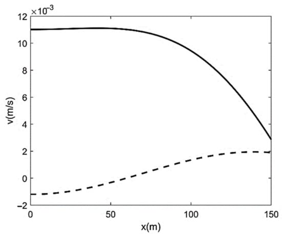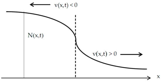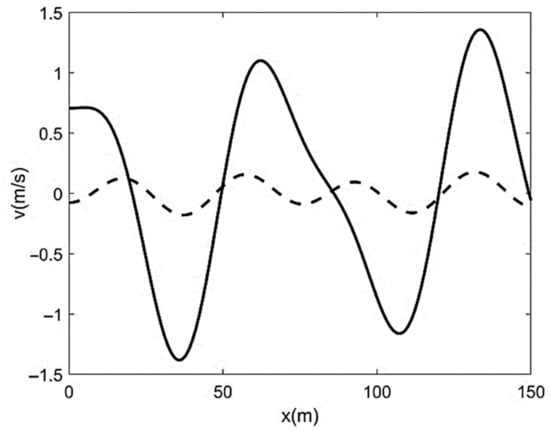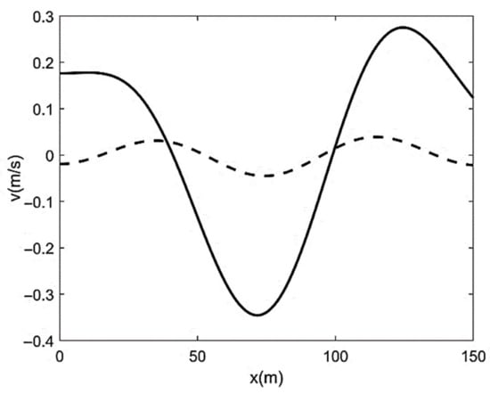 where N = 0 (that is, at x = x0 = L/2), section-averaged bed elevation coincides with the elevation obtainable from the only reach-scale trend: . For x < x0, N-profile is convex: and the small-scale three-dimensional undulations represented by migrate upstream (v(x, t) < 0) with an exponentially decaying velocity; conversely, for x > x0, N-profile is concave: and the small-scale undulations migrate downstream (v(x, t) > 0) at the same gradually decreasing rate. Note that the convex N-profile is associated with N > 0 and ; the vice versa holds for the concave counterpart. Considering that the critical state of flow implies , where indicates reach-scale critical bed slope, the quantity may be assimilated to the reach-scale critical bed elevation. In this case, hinging on basic hydraulics (e.g., []), the condition (i.e., the condition of local section-averaged bed elevation larger than the critical one) can be associated with a locally slow (sub-critical) sediment wave. The vice versa can be said in the case of concave N-profile, which would turn out to be associated with a locally fast (supercritical) sediment wave (Figure 1). Now, again from basic hydraulics, we know that small perturbations (here represented by ) typically go upstream in the presence of sub-critical free-surface flows; conversely, they go downstream in the presence of supercritical flows. Therefore, that result makes our model perfectly compatible with a sediment-stream version of the classic gradually-varied flows theory. Specifically, we know that the approximate integration of de Saint-Venant equations for rectangular channel section []: