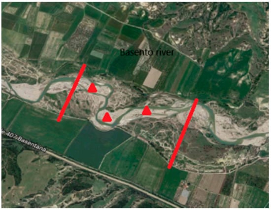 Study-case reach of Basento river—from Google Earth (modified). The two transverse red lines circumscribe the river reach under investigation. Their length is respectively proportional to Bmin and Bmax. Wave-length Λ is roughly represented by bars’ average longitudinal dimension. Flow direction is from left to right.