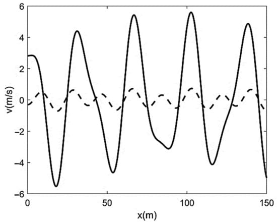 Velocity sampled by the sediment strip at t = t0 (full line) and t = τd (dotted line) for Λ = B/8.