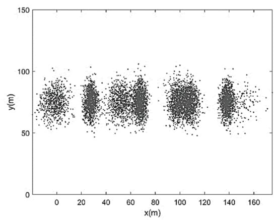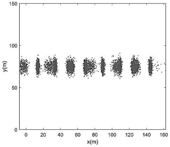 Additionally, we assumed Δ = 1 m, ξ = 2d = 0.09 m, and β = d/2 = 0.0225 m. Therefore, the initial bed elevation deviation turned out to be represented by a 9 cm-high double array of sediment particles instantaneously placed about the channel axis between x = 0 and x = B = 150 m (total number of particles: 6667), with a consistently almost zero average deviation: