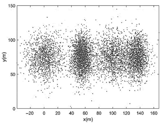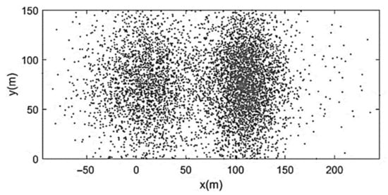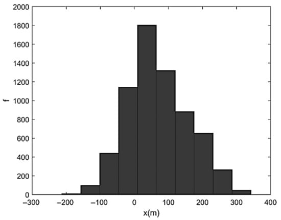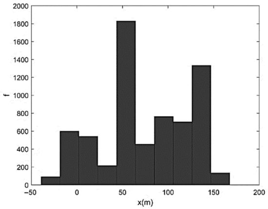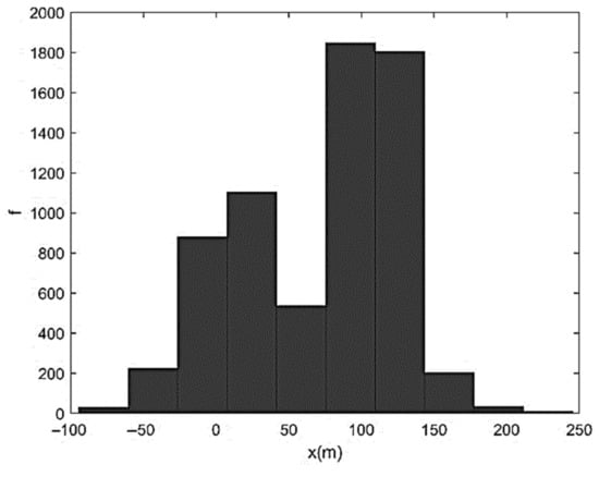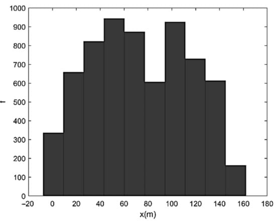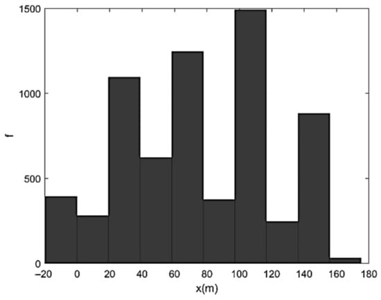 representing a characteristic diffusive time (i.e., the time needed by pure diffusion to cover a distance proportional to Λ). Figure 5 shows the solution of Equation (27) in terms of particles’ barycenter position at t = τd. Finally, Figure 6 shows the corresponding X-histogram. As one can see, the high-frequency oscillations of velocity induce a marked fragmentation of the initial sediment strip and a relatively reduced diffusion. The histogram displaying X-frequency (f) distribution exhibits an almost two-peaked shape with a central minimum. Figure 7, Figure 8 and Figure 9 show the same as Figure 4, Figure 5 and Figure 6 but referred to Λ = B/4. In this case, the initial velocity was less oscillating and overall characterized by a smaller magnitude. The number of sediment accumulation sites was reduced while their dimensions were increased due to the gradual transition from advective to diffusive regime. The X-histogram revealed a multi-peaked structure with higher concentrations of sediment in a lower number of longitudinal bands. Figure 10, Figure 11 and Figure 12 refer to Λ = B/2. The initial velocity was now rather low and only weakly oscillating. The corresponding particles’ distribution after the actual highlights the formation of three well-defined sediment accumulation sites in about 190 m, associated with three histogram peak zones. Note that the case-study in Figure 3, which represents a clearly braided branch of river Basento, and was characterized by Λ/B ≅ 1/2, include three large bars in about 220 m. The case Λ = B (Figure 13, Figure 14 and Figure 15) was the first characterized by a monotonic initially sampled velocity. From Figure 14, one can appreciate the dominant effect of diffusion (many sediment particles had already reached the boundaries at ) with considerable back-displacements (X < 0) and the slow transformation of the bed configuration into a two-dimensional sand–waves pattern. This tendency finds its maximum expression for Λ = 2B (Figure 16, Figure 17 and Figure 18), with channel width that is now almost uniformly occupied by sediment particles and the X-histogram that is rather close to a (skewed) Gaussian distribution, as in Taylor-like diffusion. Since the numerical experiments were conducted with the same B, Q, ifeq, ρs, p, and d and, therefore, with the same diffusion coefficient D, we can conclude that the tendency to maintain braiding and flow bifurcation is associated with equilibrium average bed profiles N and, therefore, equilibrium average stream power characterized by maximum period Λ that does not exceed transverse channel dimension.