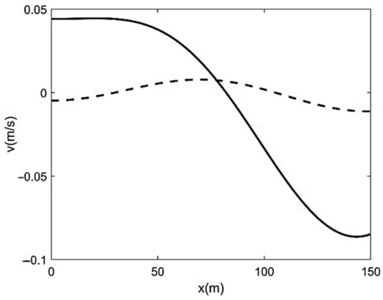 Velocity sampled by the sediment strip at t = t0 (full line) and t = τd (dotted line) for Λ = B/2.