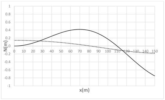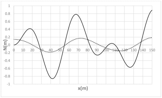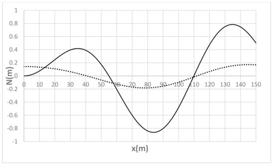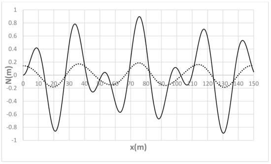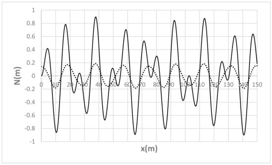 For the sake of completeness, and to analyze the free evolution of the equilibrium section-averaged bed profile, Figure 19, Figure 20, Figure 21, Figure 22 and Figure 23 show N(x) at t = t0 and t = τd for Λ = B/8, Λ = B/4, Λ = B/2, Λ = B and Λ = 2B, respectively. As one can see, due to the specific structure of (26), the pseudo-periodic behavior of the initial distribution tends to approach a perfectly periodic (other than considerably attenuated and characterized by lower frequency) oscillation, which is in turn affecting the local deviation evolution shown in the previous figures.
