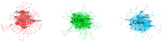 International trade network of lithium carbonate importing countries and small-scale exporting countries in 2009 (left) 2014 (middle) 2018 (right).