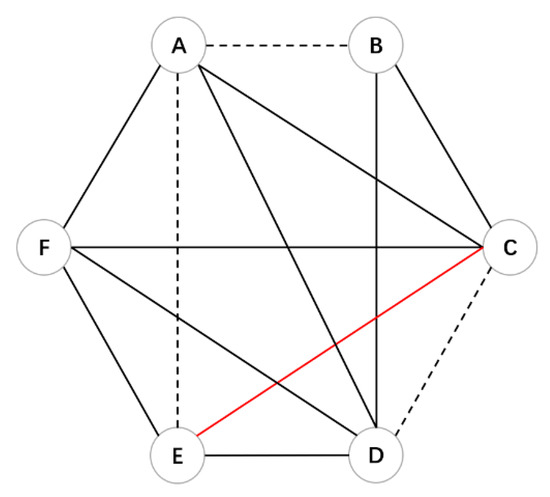 As shown in Figure 2, it can be seen that there are six nodes and 12 edges, among which 10 edges are solid lines, representing the existing links, and three edges are dotted lines, representing the links to be predicted. In order to further test the accuracy of the algorithm, we randomly select 10% of the existing trade links as the test set, here selected {CE} (marked in red). The following four algorithms, CN, AA, RA, and PA, are sequentially selected to perform the similarity calculation to obtain the following results.