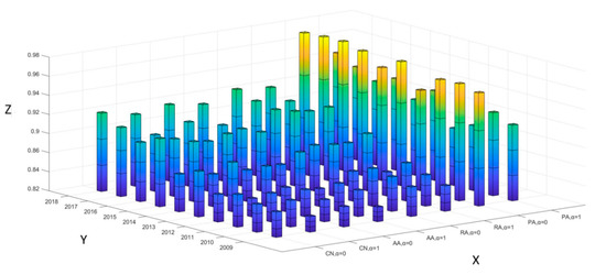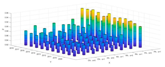 Figure 3 shows the AUC scores of the four algorithms. The Y-axis represents the years from 2009 to 2018. The X-axis represents the case where the four algorithms CN, AA, RA, and PA are, respectively, unweighted and weighted, where indicates that the transaction volume is not considered, and indicates that the transaction volume is considered. The value of the Z axis represents the AUC score result under the corresponding algorithm in the corresponding year. In order to reduce the random error and make the scoring result more scientific, the AUC score here is the average result of 10 experiments. Each of the 10 experiments randomly divided the annual data into 10% test sets and 90% training sets [35]. By comparing the scores of AUC, it can be concluded that the scores of AUC are all greater than 0.5 and close to 1, indicating that these four algorithms are feasible in the international trade data of lithium carbonate. In addition, the optimal algorithm for each year of the decade is the PA algorithm with . This shows that when using the PA algorithm to predict new trade links, it is equally important for the formation of new trade relations whether has trading volume or not. That is, in the new trade relationship predicted by the PA algorithm, a country with a large trade volume is as important as a country with a small trade volume.