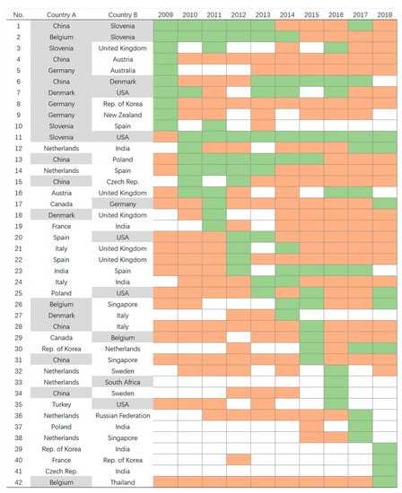 By arranging the top 10 potential links in the decade of 2009–2018, 42 pairs of countries can be obtained, as shown in Table 3.
