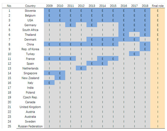 Based on the downloaded trade data and the above criteria, this paper summarizes the annual trade roles of all potential trading countries from 2009 to 2018 in Figure 7. The net exporting country is indicated by “E” and filled with blue, and the net importing country is indicated by “I” and filled with gray. If a country or region has not changed its trading role within a decade, it directly defines the trade role of that country or region. For example, Slovenia (no. 1) and Belgium (no. 2) and USA (no. 3) in Figure 7, the three countries have been judged as net exporters in the past ten years, so the final trade roles of these three countries are defined as net exporters. Similarly, countries 17–25 in Figure 7 are defined as net importers. If the trade role of a country or region changes in a decade, this paper considers that the change is caused by its reserves and the amount of exploitation, so those final roles are defined according to the roles of recent years, and are marked in gray. For example, South Africa (no. 5) was defined as a net importer in 2015 and before, but has been defined as a net exporter since 2015. According to recent changes in its role, this study judges it as a net exporter.