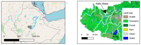 This study focuses on the upper Awash River catchment (i.e., the part of the catchment that drains to the Koka Reservoir), as shown in Figure 1. Figure 1 shows the location of the Upper Awash catchment, which covers an area of 11,600 km2 (10% of the basin), and includes the city of Addis Ababa, the capital of Ethiopia. The land use of this catchment is characterised by extensive grassland but also large areas of arable land, as shown in Figure 1), and a large urban area in its northern part of the city of Addis Ababa, which is drained by the River Akaki. Most of the water used for irrigation is drawn from the River Awash or from the Koka Reservoir.