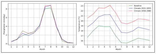 Taye et al [] estimated change factors for precipitation and temperature as the difference between values in the baseline conditions and values for the future time slices. In particular, change factors were estimated in a spatially distributed manner (i.e., over a regular grid) and on a monthly scale (i.e., a different value for every month of the year). In the present study, the average change factors for the period 2031–2055 and 2056–2080 were used to alter the baseline temperature and precipitation series and create potential future climate series to be used as input for the INCA model, in order to obtain values of streamflow and nutrient loads impacted by climate change. Figure 2 shows the resulting monthly average precipitation and temperature time series for the upper Awash catchment. Note, there is a significant increase in temperature predicted by the climate models, but this reflects the worst-case scenario as represented by the RCP8.5 scenario selected by the climate modellers.