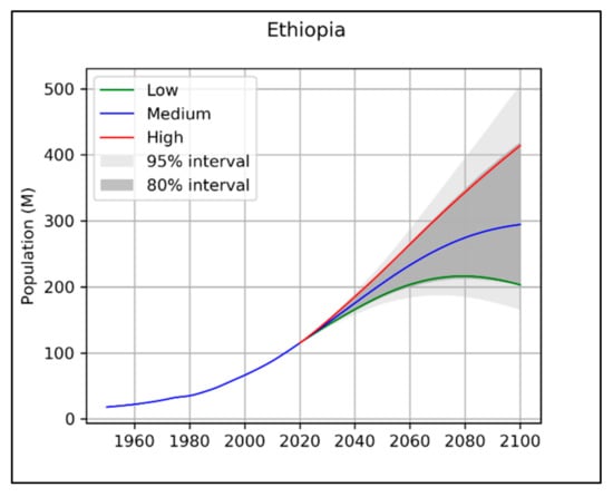 The impact of population growth was accounted for by altering the effluent flows from sewage treatment plants proportionally to the population projections contained in the World population trends of the United Nations []. This report indicates an average increase of 58% for the 2031–2055 period and of 110% for the 2056–2080 in Ethiopia. Therefore, the effluent flows previously computed based on the current population were increased accordingly, keeping the effluent concentration of nutrient at the same level (i.e., assuming that no changes in wastewater treatment are applied). Figure 3 shows the projected population growth for Ethiopia.