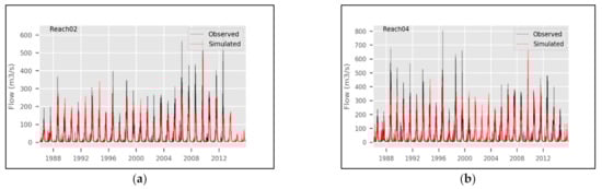 Flow model results simulated versus observed for Reaches 2 (a) and 4 (b) on the Awash River.