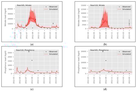 Water quality model results for nitrate and phosphorus at Reaches 5 and 18 (the red shaded area indicates the whole range of the 15 model ensemble results).